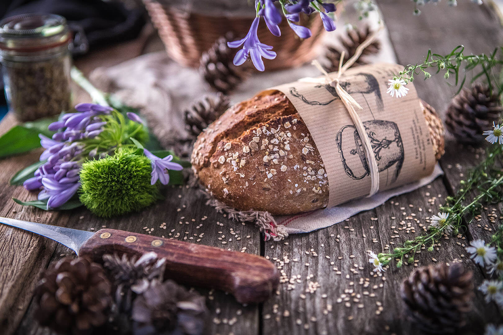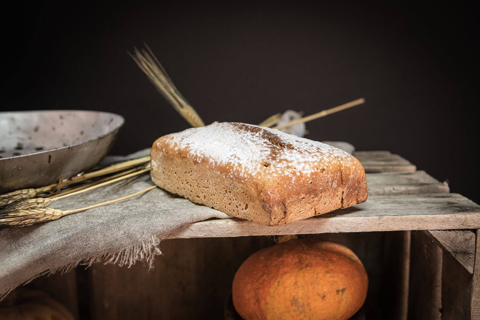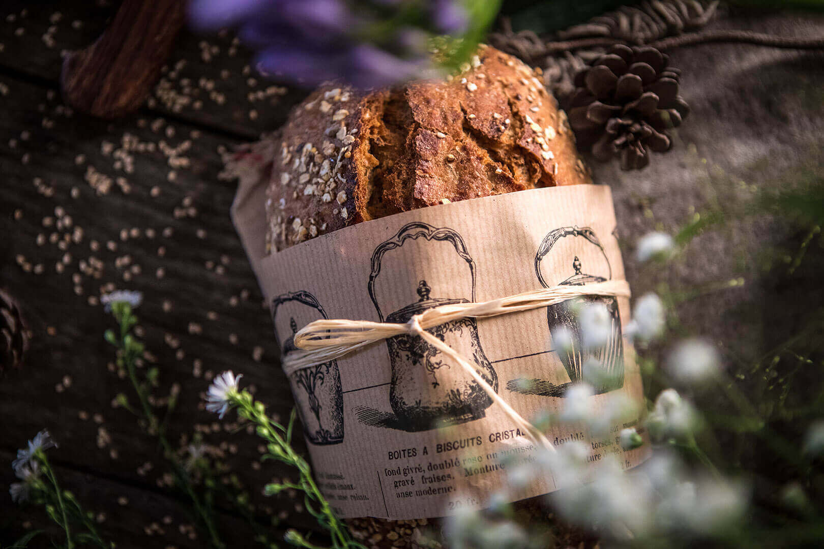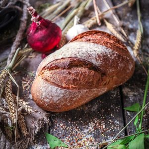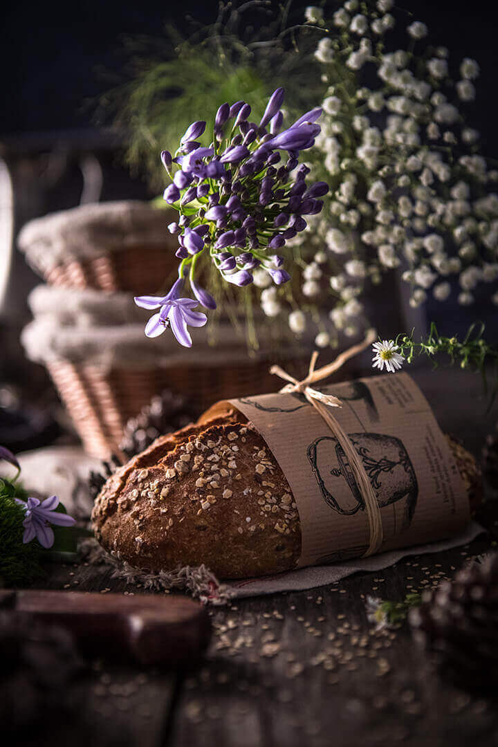 Le Pain Champêtre est un pain à conçu avec des farines semi-complètes de blé, de seigle, d’avoine et de sarrasin. Sa croûte est sertie des graines et des flocons que l’on retrouve de manière subtile dans la mie. C’est un pain riche en arômes, avec une belle cuisson à cœur. Ses alvéoles sont nacrées, de différentes tailles. Sa mâche alterne entre le fondant de la mie et le léger croquant…Le pain Grand Épeautre