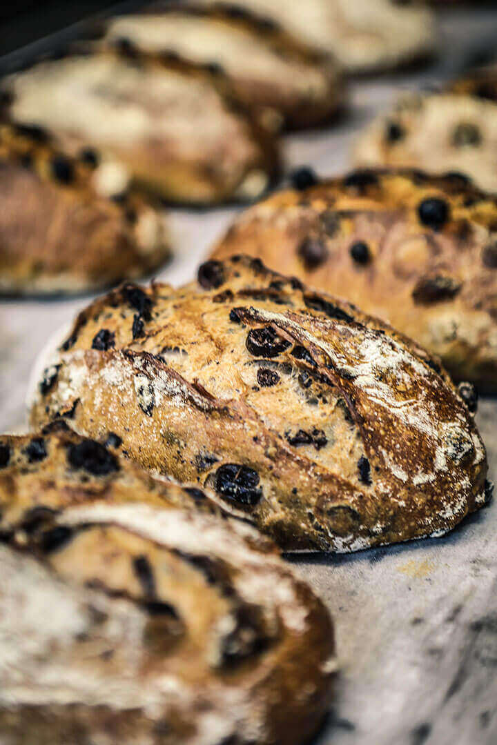 Généreusement garni d’un tiers de noix, ce pain est fabriqué à partir d’une base semi-complète. Sa mie se teinte d’une jolie couleur mauve dûe à la décoloration du brou de noix bio. C’est un pain gourmand et réconfortant qui donne la sensation de goûter à un gâteau. Le Pain aux noix est préparé avec de la farine écrasée à la meule de pierre, du levain naturel (sans aucun additif de…Le pain aux Olives