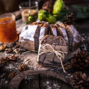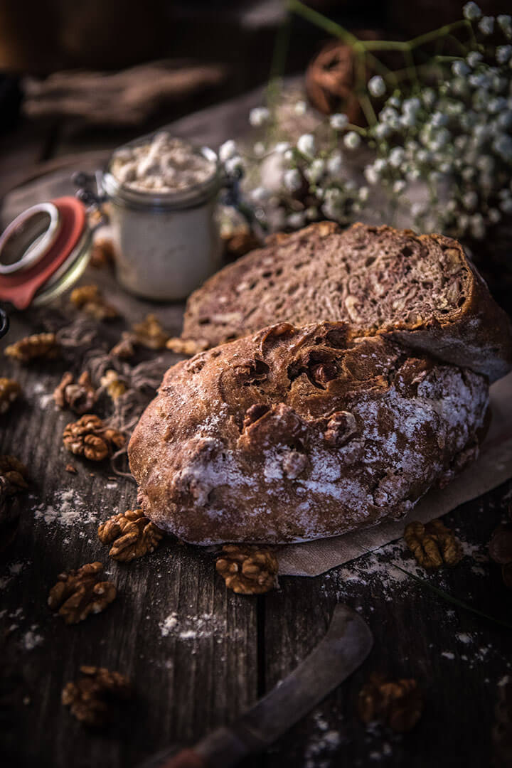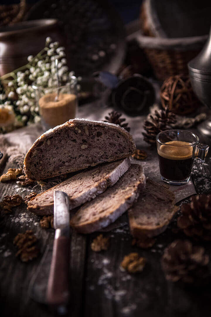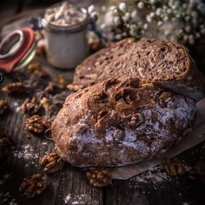 Le Pain au Souchet est un pain moulé, aux nuances caramel. La farine de souchet, connue pour ses qualités nutritionnelles, ne contient pas de gluten. Sa mie aux petites alvéoles a de légères saveurs de cacahuète. Le Pain au Souchet est préparé avec de la farine de souchet écrasée à la meule de pierre, du levain naturel (sans aucun additif de levure), de l’eau, juste ce qu’il faut de sel…Le pain aux Noix