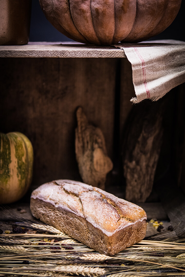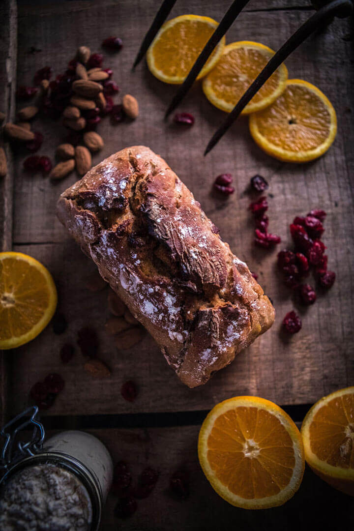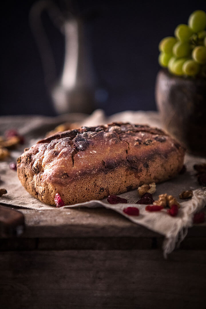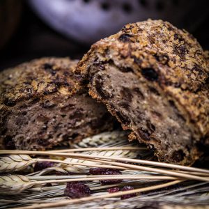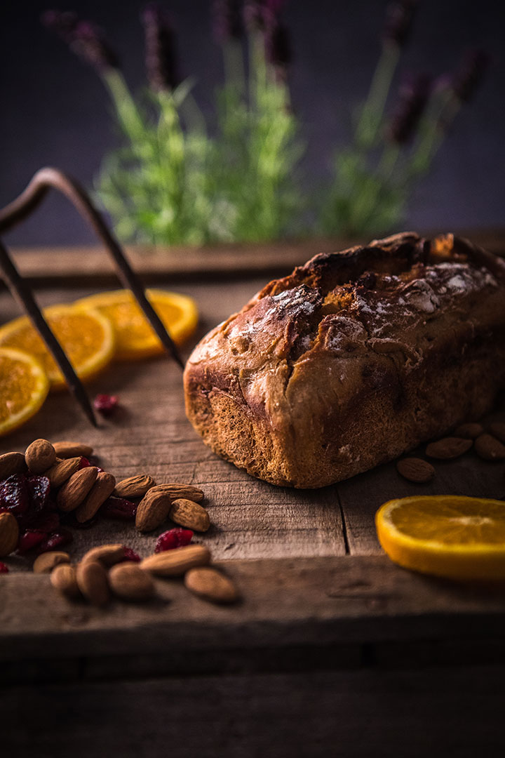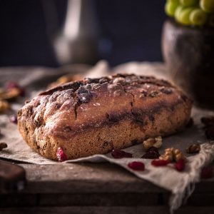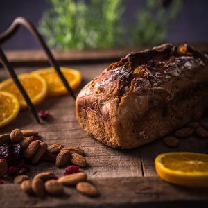 Le Pain Mi-figue Mi-raisin est d’abord un régal pour les yeux : c’est un pain moulé, fariné sur le dessus, qui prend très facilement des airs de gâteau de Noël. Une fois tranché, on découvre l’opulence de figues, de raisins et de noisettes entières qui prennent la vedette sur la farine de seigle ! A la dégustation, c’est un pain à la mie onctueuse, dont la mâche alterne entre le…Le pain Cranberries Oranges Confites