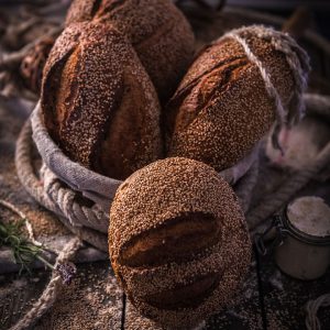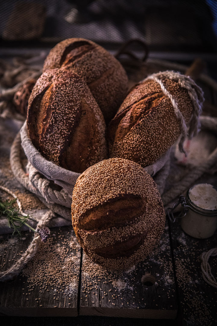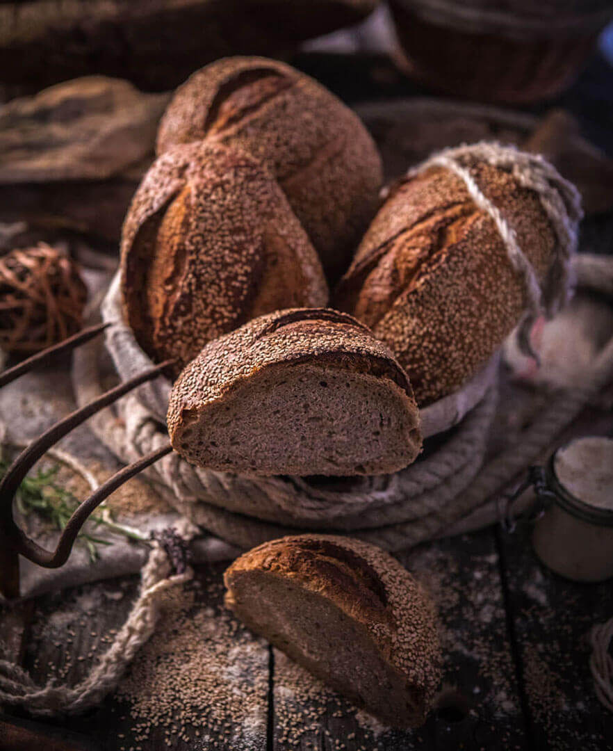 Le Pain au Seigle est un pain moulé, à la couleur noisette, produit à partir de farine intégrale. Il n’a que très peu à voir avec ses cousins du commerce : très peu acide en raison d’une fermentation subtile, le seigle est ici sublimé. Sa croûte est brune, sa mie brillante et resserrée. Sa mâche est légèrement collante avec un petit côté “gâteau”. Ses arômes torréfiés prennent toute leur intensité…Le pain au Sésame