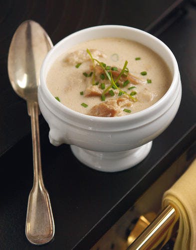 Versez le fond de volaille ou de veau. Ajoutez la crème fraîche. Salez, poivrez. Portez à ébullition en mélangeant délicatement. Laissez mijoter pendant 20 min. Servez bien chaud, parsemé d’herbes ciselées.